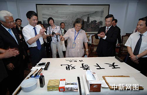 在觀看日全食版錢塘潮后,詩(shī)琳通盛贊“非常好”。在現(xiàn)場(chǎng)人員的掌聲中,詩(shī)琳通還以毛筆親自書寫了“天下奇觀”四個(gè)大字。