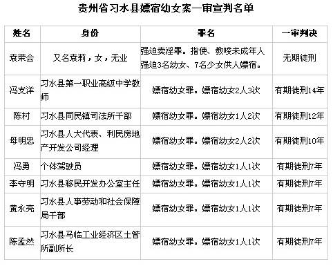 其中,被告人馮支洋(習(xí)水縣第一職業(yè)高級(jí)中學(xué)教師)嫖宿幼女2人3次;被告人陳村(習(xí)水縣同民鎮(zhèn)司法所干部)嫖宿幼女1人2次;被告人母明忠(習(xí)水縣人大代表、利民房地產(chǎn)開發(fā)公司經(jīng)理)嫖宿幼女2人2次;被告人馮勇(個(gè)體駕駛員)、李守明(習(xí)水縣移民開發(fā)辦公室主任)、黃永亮(習(xí)水縣人事勞動(dòng)和社會(huì)保障局干部)、陳孟然(習(xí)水縣馬臨工業(yè)經(jīng)濟(jì)區(qū)土管所副所長(zhǎng))分別嫖宿幼女1人1次。