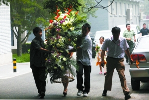 上午11時(shí)許,原國家體委主任伍紹祖前來吊唁,他身著黑色西服,面色凝重,他看著工作人員從車上卸下花圈后進(jìn)入大院。