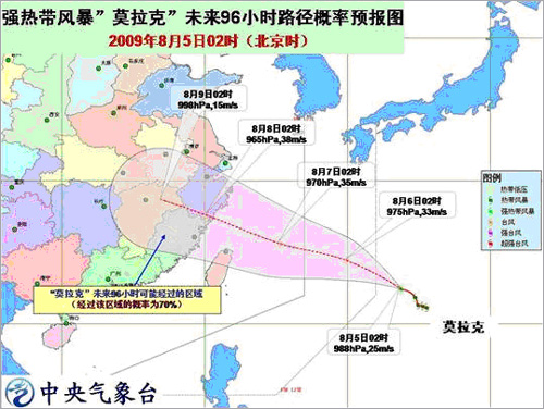 中新網(wǎng)8月5日電 據(jù)中國氣象局網(wǎng)站消息,據(jù)中央氣象臺消息,今年第8號熱帶風暴“莫拉克”(MORAKOT)于今天凌晨加強為強熱帶風暴,今天早晨5時其中心位于臺灣基隆東偏南方向大約1230公里的西北太平洋洋面上,就是北緯22.4度、東經(jīng)133.6度,中心附近最大風力有10級(25米/秒)。