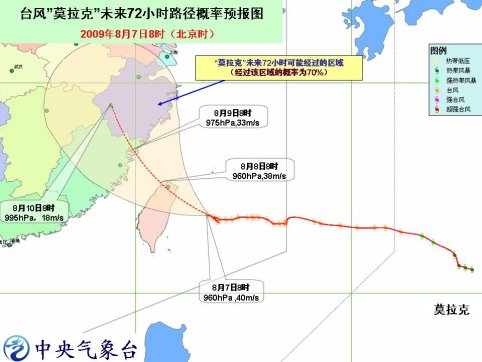 預(yù)計(jì),“莫拉克”將以 每小時(shí) 15 公里左右的速度向西北方向移動(dòng),將于今天 傍晚前后登陸臺(tái)灣東北部,然后向福建北部到浙江中部一帶沿?拷,并有可能于明天下午到后天早晨在向福建北部到浙江中部一帶沿海登陸。