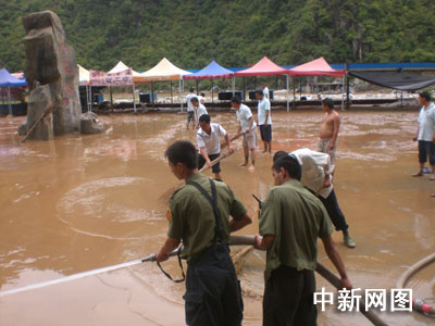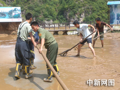 一到現(xiàn)場,消防隊員就立即鋪設水帶。在專門消防器材的幫助下,消防隊員開始對廣場淤泥進行清理。經(jīng)過艱苦奮戰(zhàn),通往景區(qū)的道路被打通,布滿淤泥的桃花谷廣場終于煥然一新,又露出了昔日干凈美麗的“面龐”。 完