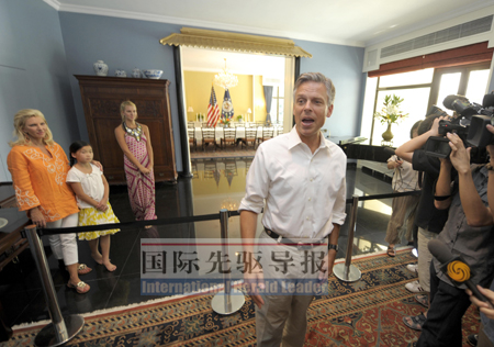 8月22日,洪博培開始了上任美國駐華大使的第一天工作,而第一項(xiàng)任務(wù)就是在中外記者面前亮相。記者會(huì)時(shí)間一到,洪博培就帶著家人健步走來,雖然年近50歲,已有些銀絲出現(xiàn),但記者站在洪博培面前,感覺到的卻是年輕和朝氣。