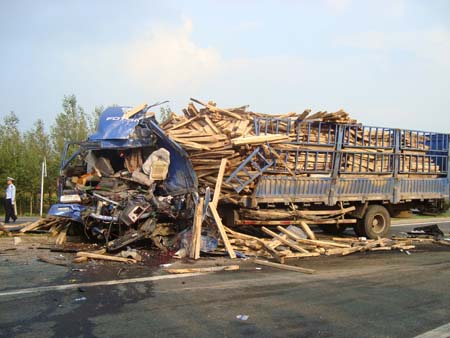 記者趕到現(xiàn)場(chǎng)時(shí)看到,現(xiàn)場(chǎng)已經(jīng)設(shè)立了警戒線,一輛白色大客車頭部扎進(jìn)路邊溝內(nèi)樹(shù)林,頂著兩棵小樹(shù),只有后輪還搭在柏油路上?蛙嚽安颗で,車頂蓋被掀起,風(fēng)擋玻璃破碎,車前部、地上、車內(nèi)到處可以看到斑斑血跡,還有一些零碎物品。在距離客車車尾4米左右,一輛拉著木板的藍(lán)色貨車車頭朝向松原方向停放在路上,車前部全部凹陷進(jìn)去,里面有大量血跡,車上木頭散落一地。