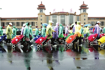 在天安門前,每隔8米一個崗哨,每個武警的腳下,都放著一個裝著雨衣的布包。下午4點半,因降雨變大,不但武警穿上了深綠色雨衣,長安街沿街的所有音響也都套上了“雨衣”。