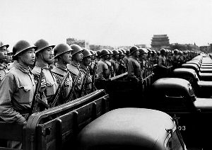 1949年10月1日開國大典,因?yàn)槿姏]有統(tǒng)一的服裝,按照閱兵指揮部的要求,受閱的陸軍部隊(duì)全部著黃綠色軍裝,頭戴鋼盔,帽徽為“八一”紅五星,左胸前佩戴印有“中國人民解放軍”字樣的長方形胸章。受閱的海軍方隊(duì),干部戴白色大檐帽,扎白色腰帶;戰(zhàn)士戴白色水兵帽,腦后飄動(dòng)著兩條黑色緞帶,身著藍(lán)白相間的;攴?哲婏w行員身著飛行服駕機(jī)受閱。受閱的女兵則穿著黃色的連衣裙。
