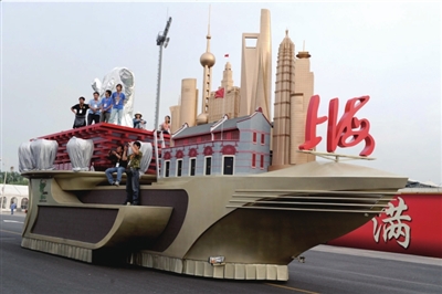 張偉斌說(shuō),北京的彩車(chē)旨在突出“人文、科技、綠色”三大主題,彩車(chē)周?chē)枪蕦m的圍墻,加以紅色的飄帶和綠色的彩飾,前端是天壇的微型建筑,中間是一個(gè)轉(zhuǎn)盤(pán),尾端是鳥(niǎo)巢和水立方的結(jié)合。