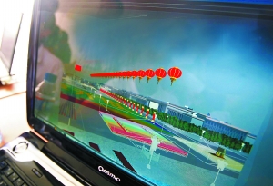昨天下午1時(shí)許,位于密云的群眾游行訓(xùn)練場(chǎng)。參加演練的群眾還未到場(chǎng),一群技術(shù)人員卻已經(jīng)忙碌開了:指揮臺(tái)上架起的兩排筆記本電腦,屏幕上一個(gè)個(gè)惟妙惟肖的“動(dòng)畫人”排成的方陣,正邁著整齊的步伐,依次通過酷似天安廣場(chǎng)的虛擬場(chǎng)景,這場(chǎng)面乍看上去很像是個(gè)逼真的電子游戲。