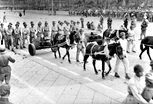緊跟海軍方隊的,是由8000多人組成的12個步兵方隊。除了3個建制步兵團,步兵方隊還包括臨時編組的沖鋒槍、輕機槍、通信、重機槍、輕迫擊炮、重迫擊炮、戰(zhàn)防炮、山炮各1個營。
