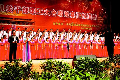 由省直機(jī)關(guān)工委主辦的“歌唱祖國——省直機(jī)關(guān)干部職工大合唱”競賽活動,是省委、省政府慶祝新中國成立60周年系列慶典的重要內(nèi)容。自今年6月啟動以來,省領(lǐng)導(dǎo)高度重視,各部門大力支持,廣大干部職工積極響應(yīng),共組織100支隊(duì)伍、8000余人參賽,1萬多名干部職工到現(xiàn)場觀摩,省委書記羅清泉、省長李鴻忠等省領(lǐng)導(dǎo)和省直各部門主要負(fù)責(zé)同志帶頭參加演唱。參加匯報(bào)演出的22支隊(duì)伍,代表省直各條戰(zhàn)線,用精彩的演出,唱響共產(chǎn)黨好、社會主義好、改革開放好、偉大祖國好、各族人民大團(tuán)結(jié)好的主旋律,展示了省直機(jī)關(guān)干部職工良好的精神風(fēng)貌。(記者徐和平、通訊員胡振剛)