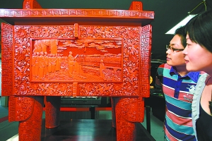 由雕漆工藝完成的鼎盛中華造型以司母戊鼎為原型,重達(dá)300多斤。制作時(shí)先經(jīng)過半年時(shí)間刷上240多層漆,再在1.2厘米厚度的漆面上進(jìn)行手工雕刻。其正面以油畫“開國大典”為內(nèi)容,背面題為“中華賦”及長城圖案。象牙作品以長兩米、重320斤的百年“老”象牙材料為基,以56個(gè)民族載歌載舞為主題,背景是30處世界文化遺產(chǎn)。象牙、雕漆、玉器和景泰藍(lán)被譽(yù)為工藝美術(shù)界的“四大名旦”,另外兩項(xiàng)巨作景泰藍(lán)“太平有象”和玉雕“九龍?jiān)》稹币矊㈥懤m(xù)亮相。 (記者耿諾)