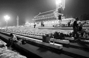 昨日,天安門城樓前東西兩側(cè)、人民大會堂北門外臨時觀禮臺上,工人開始加裝長凳,并鋪設(shè)紅色地毯。前日,孫中山像亮相廣場。