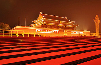 城樓下紅色觀(guān)禮臺(tái)同樣是外賓的一個(gè)重要集中場(chǎng)所。能登上這里的外賓主要分為幾個(gè)方面:一個(gè)是常駐北京的外國(guó)使節(jié)及夫人;一個(gè)是各國(guó)使館的武官及夫人;第三個(gè)就是各國(guó)家代表團(tuán)的隨團(tuán)人員。他們一般被安排在緊挨著天安門(mén)城樓東側(cè)最近的那個(gè)觀(guān)禮臺(tái),憑請(qǐng)?zhí)M(jìn)入,觀(guān)禮證佩戴左胸前,一般在開(kāi)會(huì)前一個(gè)小時(shí)入席,而且不能帶小孩。
