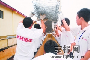 在房山一間面積達(dá)1500米的煙花專用倉庫,200名熊貓煙花工作人員星夜兼程,干了近100天,將30余萬發(fā)煙花分別定位到3個(gè)巨型網(wǎng)幕上。為了防備國慶夜降雨,技術(shù)人員使用了電子加固器,給“網(wǎng)幕焰火”穿上了統(tǒng)一規(guī)格的“風(fēng)雨衣”。