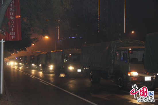 雨后的長(zhǎng)安街一片清新,萬(wàn)達(dá)購(gòu)物廣場(chǎng)、雕塑公園花壇等照明燈的點(diǎn)綴,讓薄霧下的北京格外妖嬈。期間,一列車隊(duì)從西五環(huán)方向緩緩駛來(lái),這是為參加今天上午國(guó)慶閱兵的武警某部隊(duì)。雖然是夜間行車,但是車上的小戰(zhàn)士情緒很高,一路上有說(shuō)有笑。(北京時(shí)間1時(shí)45分 記者馮竹長(zhǎng)安街報(bào)道)