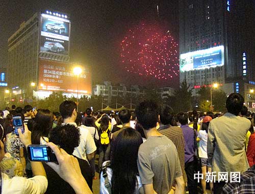 當晚8時,早已準備就緒的禮花彈在成都市區(qū)內6個燃放點同時升空,綻放的焰火無比璀璨,給成都夜空披上了一件華麗的袍子。成都民眾紛紛走出家門,來到自家的樓頂或聚集在鬧市區(qū),共賞了這臺慶祝新中國60華誕的焰火“盛筵”。