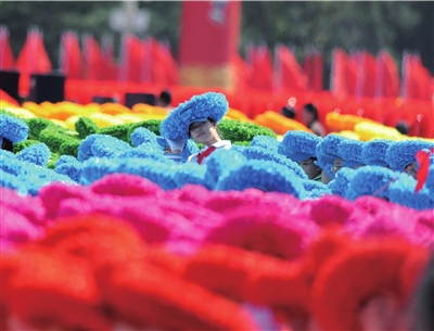 路建康說,他要感謝組成七色光方隊的1500名四、五年級的小學生們。這些孩子站在背景最前沿,離閱兵隊伍最近,他們組成了七彩花環(huán),寓意團圓。游行結束,七色光方隊要涌向金水橋。