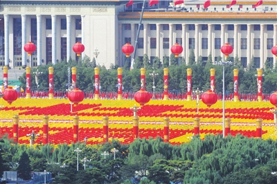 昨天的背景文字包括“中華人民共和國萬歲”“中國共產(chǎn)黨萬歲”“人民萬歲”“社會主義好”等,圖案包括金黃色麥田、五星紅旗、盛開的牡丹、長城、和平鴿等,而巨幅國畫《江山如此多嬌》,尤其令人印象深刻。