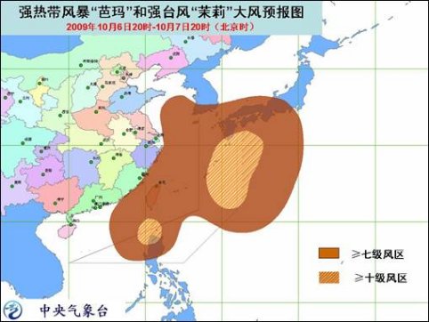 受“茉莉”和南下冷空氣的共同影響,6日夜間至7日白天,東海大部、黃海南部將有7-8級大風,陣風可達9-10級,其中東海東部將有9-10級大風,陣風可達11-13級。