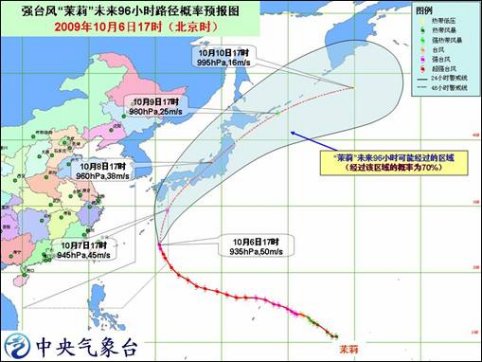 預計,“茉莉”將以每小時25公里左右的速度向偏北方向移動,7日將轉(zhuǎn)向東北方向移動,強度趨于減弱,并逐漸向日本中部沿?拷。