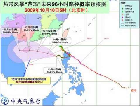中新網(wǎng)10月10日電 中央氣象臺(tái)今日發(fā)布臺(tái)風(fēng)預(yù)報(bào):12-13日,今年第17號(hào)熱帶風(fēng)暴“芭瑪”將以每小時(shí)10公里左右的速度向偏西方向移動(dòng),向中國(guó)海南東部到廣東西南部一帶沿?拷,強(qiáng)度變化不大。