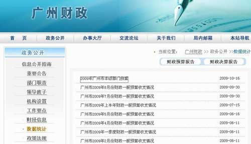查詢方式為,登陸廣州財(cái)政網(wǎng)站()后,點(diǎn)擊打開“政務(wù)公開”欄目中的“數(shù)據(jù)統(tǒng)計(jì)”一欄(/zwgk/sjtj/index.htm),可以看到《2009年廣州市本級部門預(yù)算》的鏈接,打開之后為一個(gè)簡單的114個(gè)部門的索引列表。