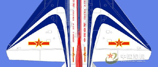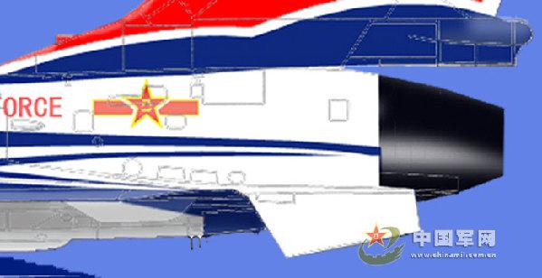 殲-10表演機(jī)的機(jī)徽與空軍軍機(jī)機(jī)徽相同,為軍徽兩邊襯一鑲有對稱的金黃色等邊的紅帶,中間嵌金黃色“八一”二字,“八一”為宋體漢字。噴涂在機(jī)身后部左右兩側(cè)、左右機(jī)翼上表面,共4處(見圖7、8、9)