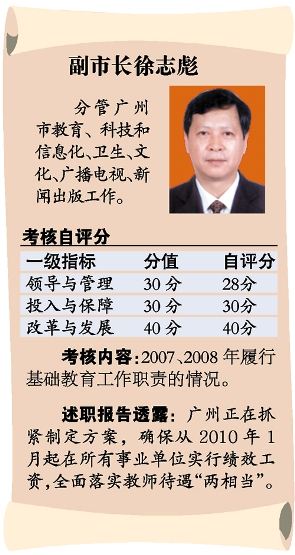 徐志彪在自評分說明中,給自己這兩年的工作成績都打了98分,并在述職報告中表示,廣州正在抓緊制定方案,確保從2010年1月起在所有事業(yè)單位實行績效工資,全面落實教師待遇“兩相當”。