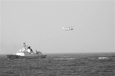 “白鷺洲”號油輪船員一面用消防水龍頭向接近的“海盜快艇”噴射高壓水流,一面向我海軍護航編隊求救!爸凵健迸炄缫粭l白色蛟龍,疾速向“海盜快艇”聚集海域駛來。我護航編隊直升機上特戰(zhàn)隊員接連對“海盜快艇”進行攔阻射擊,并由“舟山”艦派出2艘艦載小艇對“海盜快艇”進行登臨檢查!八{天戰(zhàn)鷹”和“銀色蛟龍”聯(lián)手驅(qū)散了船員心中的陰霾。