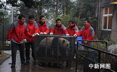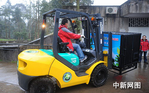 中新網(wǎng)成都11月27日電 (記者楊杰) 27日早上8時30分,在臥龍中國保護(hù)大熊貓研究中心白熊坪,工作人員一片忙碌,開始將赴澳大利亞的大熊貓“網(wǎng)網(wǎng)”、“福妮”裝籠,并送上卡車整裝待發(fā)。10時整,歡送“網(wǎng)網(wǎng)”、“福妮”儀式舉行,中澳雙方動物專家和相關(guān)官員出席。隨后,在家鄉(xiāng)人民祝福和不舍的目光中,車隊緩緩駛離雅安,前往成都雙流國際機(jī)場。