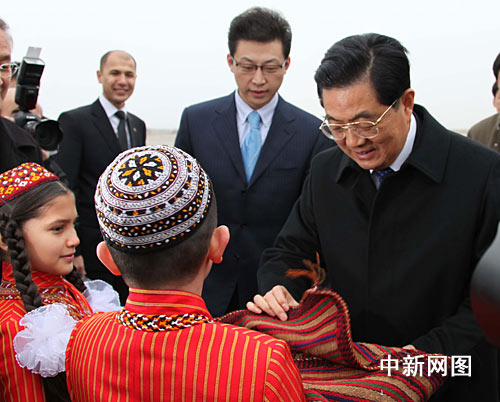 土庫曼斯坦政府官員和當(dāng)?shù)厝A僑華人趕到機(jī)場(chǎng)迎接。兩名土庫曼兒童分別向胡錦濤獻(xiàn)花和面包,請(qǐng)胡錦濤掰下兩小塊面包品嘗。
