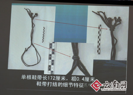 警方通過幻燈片展示了兩條單根長172厘米,粗0.4厘米的鞋帶。此鞋帶來源于邢鯤所穿的一雙高幫旅游鞋。邢鯤是經過警方檢查,將鞋置于候問室外后,把兩根鞋帶藏匿于上衣口袋中帶入候問室的。