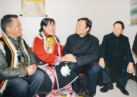 李源潮一下火車,就與同來慰問的省委書記、省人大常委會主任劉奇葆一起直奔北川縣看望災(zāi)區(qū)群眾,來到剛剛重建起來的擂鼓鎮(zhèn)吉娜羌寨。在地震中羌族同胞劉賢惠失去了丈夫、王孝萬失去了妻子,在當(dāng)?shù)攸h委政府的關(guān)心下,他倆災(zāi)后組成了新家庭,住上了新房子,找到了新產(chǎn)業(yè),過上了新生活,有了新希望。劉賢惠緊緊拉著李源潮的手說:“感謝黨、感謝政府!全靠黨的政策好,讓我們?yōu)暮筮^上了好日子!”李源潮祝愿他們白頭偕老,日子越過越好。