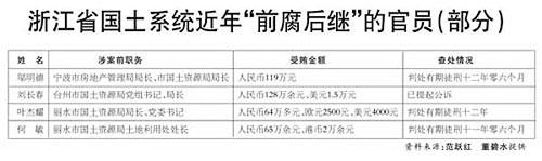 事實(shí)上,據(jù)統(tǒng)計(jì),不僅是浙江,近年來落馬的貪官不少都與房地產(chǎn)潛規(guī)則下的腐敗有關(guān),財政部原副部長朱志剛,北京市原副市長劉志華,山東省委原副書記、青島市委原書記杜世成,天津市政法委原副書記、天津市人民檢察院原檢察長李寶金,湖南省郴州市原市委書記李大倫,安徽省原副省長何閩旭,昆明市規(guī)劃局原局長曾華,上海房地局原副局長殷國元,江蘇省蘇州市原副市長姜人杰,重慶市規(guī)劃局原局長蔣勇,重慶市沙坪壩區(qū)原副區(qū)長陳明,福州市國土資源局原局長王炳毅,福州市倉山區(qū)土地局原局長李仲……都與房地產(chǎn)腐敗有關(guān)。