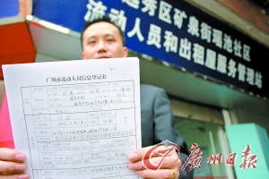 然而記者仔細(xì)看了看工作人員要求填寫的登記表,卻發(fā)現(xiàn)還是原先辦暫住證時(shí)所填的《廣州市流動(dòng)人員信息登記表》,至于居住證的申請表是何模樣,就連工作人員也稱沒能見上一眼。