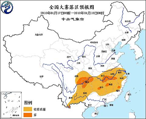 中央氣象臺(tái)2010年1月17日06時(shí)發(fā)布大霧藍(lán)色預(yù)警: