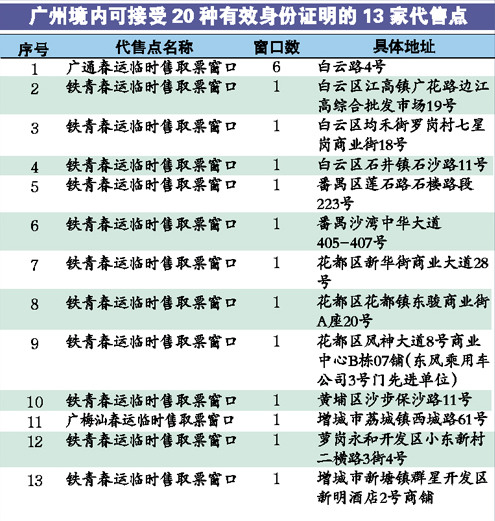 持除二代居民身份證以外的19種有效身份證件購票,在鐵路部門設立的集中售取票點、車站售票窗口以及廣東境內的79家代售點可以購買實名制車票,記者了解到,其中廣州有13家這樣的代售點,大部分分布在白云區(qū)、番禺區(qū)、花都區(qū),其他代售點可以辦理二代身份證購買實名制火車票。
