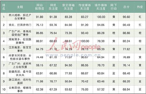 傳統(tǒng)媒體關注度由100多家中央級媒體、市場化媒體、廣播電視媒體等三類媒體的報道數量做加權處理后統(tǒng)計所得;網站推薦由主要新聞網站的網站報道評論數、專題數、在線調查數、嘉賓訪談次數等4項數據做加權處理后統(tǒng)計所得;網民關注度由網民在主要網絡社區(qū)/BBS、博客上的發(fā)表(發(fā)帖)量、瀏覽量數據做加權處理后統(tǒng)計所得;意見領袖關注度由400余位“意見領袖”的博文、BBS帖文和在學術文化類網站發(fā)表的言論三項數據做加權處理后統(tǒng)計所得;境外媒體關注度依據對路透社、BBC、美聯社、紐約時報、泰晤士報、星島日報、聯合早報、FT中文網、鳳凰網等25家境外媒體的報道數量統(tǒng)計、處理后所得;網下行動依據各事件所引發(fā)的網下行動的規(guī)模、激烈程度進行評估后所得,分為紅、橙、黃、藍四個級別,熱度相應由高至低。
