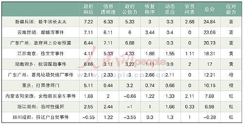 人民網輿情監(jiān)測室從100多家境內外報刊的新聞報道和評論,8家門戶網站的新聞跟帖,約30家論壇/BBS,400余名網絡“意見領袖”博客,以及微博客、QQ群和播客網站中,梳理出了2009年第四季度十件“輿情熱點事件”,并按照“政府響應、信息透明度、政府公信力”3個常規(guī)指標,以及“恢復秩序、動態(tài)反應、官員問責”3個特殊指標,對2009年第四季度十件“輿情熱點事件”的政府應對、處置能力做出了評估,結論是: