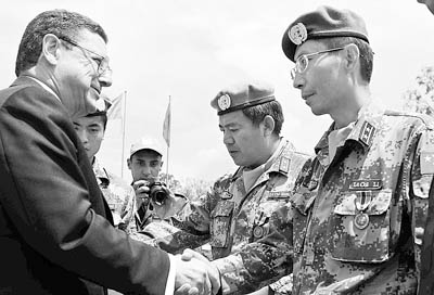 當地時間昨天中午,中國第十批赴剛果(金)維和醫(yī)療、工兵分隊聯(lián)合舉行盛大儀式接受聯(lián)剛團授勛。聯(lián)剛團最高官員、聯(lián)合國秘書長潘基文特別代表阿蘭多斯專程從金沙薩趕到布卡武的中國半島,親手為中國維和官兵頒授聯(lián)合國和平勛章。據悉,這種聯(lián)剛團最高規(guī)格的授勛儀式,在布卡武任務區(qū)各國維和分隊中尚屬首次。中國駐剛果(金)大使吳澤獻和武官畢京三也從剛果(金)首都趕來參加這一儀式。