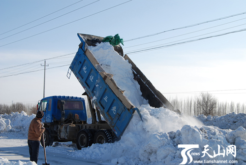 在塔城市,記者剛好碰到了一輛小四輪車裝滿了厚厚的雪向郊外倒雪點(diǎn)駛?cè)。小四輪車從市中心的友好路、新華路,又穿過3條街道,行了約10公里,在位于城西的經(jīng)濟(jì)開發(fā)合作區(qū)內(nèi)停了車。