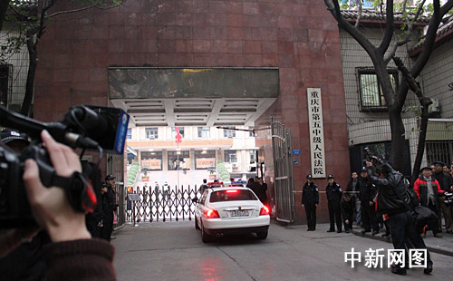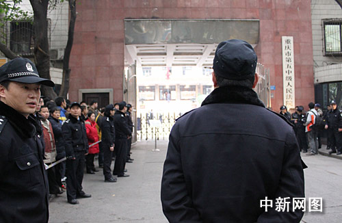 今天一早,中新網(wǎng)記者在重慶市第五中級人民法院門口看到,雖然法院門口沒有荷槍實彈的法警站崗,但法院周邊的警力布控比此前的打黑審判更為嚴密、警力更為密集,記者和旁觀者均禁止靠近法院大門。記者注意到,執(zhí)行任務的數(shù)十位警察均未佩戴警號。當記者詢問是否與今天受審對象有關時,一警察以“不好說”作答。