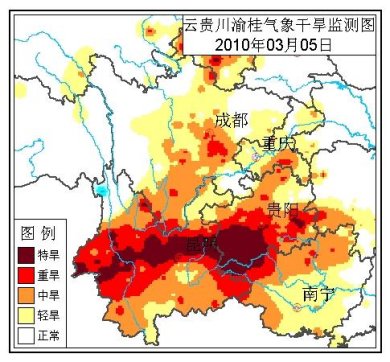 中新網(wǎng)3月5日電 中央氣象臺3月5日18時繼續(xù)發(fā)布干旱黃色預警:根據(jù)3月5日監(jiān)測,云南大部、貴州大部、四川南部和廣西西北部等地維持氣象干旱重旱等級。預計,未來三天,除云南西北部和東北部、貴州大部有小到中雨(雪)外,其它旱區(qū)基本無降水。云南大部、貴州西部、四川南部、廣西西部氣象干旱將持續(xù)發(fā)展。