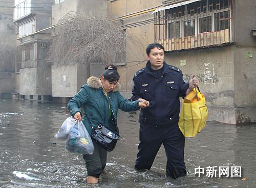 大量的融雪性洪水向倉房溝村一帶低洼處涌積,致使土柸結(jié)構(gòu)的居民住房被洪水浸泡,有垮塌之險。另一處的大量洪水涌入近處一棟居民樓,民警立即組織警力進(jìn)入樓內(nèi)進(jìn)行施救,挨家挨戶動員居民撤離住所,并攜老扶幼將婦女兒童帶離危險地帶。