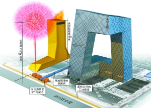 2008年12月下旬,沙鵬、李小華、宋哲元、劉發(fā)國(guó)4人前往央視工地,確定在央視主樓、配樓間的通道燃放,具體位置在通道西頭,緊挨著三環(huán)輔路。隨后劉發(fā)國(guó)邀請(qǐng)沙鵬、李小華前往廊坊國(guó)際酒店看了一場(chǎng)30萬(wàn)元的焰火表演。