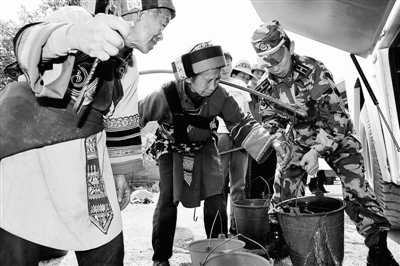為了讓災區(qū)群眾早日告別“滴水貴如油,天天為水愁”的日子,廣大官兵和民兵預備役人員采取建臨時抽提水設施、打水井、建水柜、筑塘壩、截潛流、接山泉等措施,盡最大可能滿足群眾生活和生產用水需要。