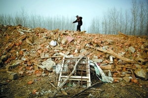 3月29日,陶興堯屋子只剩下被拆后的廢墟,屋子南側(cè)丟著四個(gè)半米高的紅色滅火器。