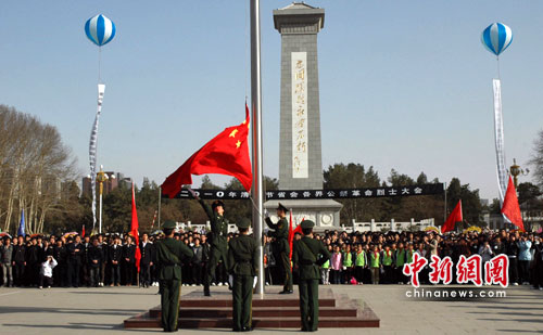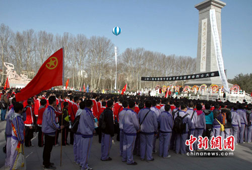 中新網(wǎng)石家莊4月2日電(牛琳 田國祥)2日,2010年清明節(jié)省會各界公祭革命烈士大會在華北軍區(qū)烈士陵園舉行。來自部隊、學(xué)校、醫(yī)院等各界人士約5萬人參加了公祭儀式。