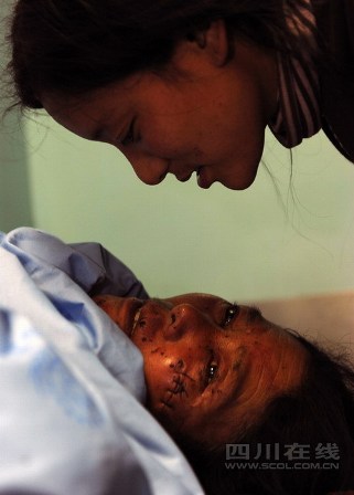 當(dāng)滿載傷員的急救車隊(duì)飛馳在機(jī)場高速時(shí),潘蓮英打開了手機(jī),女兒牟元霞打來電話,“爸爸還好嘛?”“好!我們馬上就到醫(yī)院了!碧稍趽(dān)架上的牟炳學(xué)聽到女兒的問候,再也控制不住自己的情緒,眼淚順著布滿血痂的眼角不停流淌。