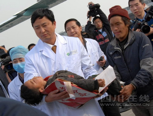 下午5時(shí)10分,空運(yùn)到成都的首名傷員被抬上第一輛救護(hù)車,傷員的口、鼻、眼睛布滿了血痂,手腕、手臂上全是傷痕。抬上擔(dān)架后,隨車主治醫(yī)生余海放立即對其測量血壓、心率,詢問有何不適,并進(jìn)行了登記。傷員的右手腕上拴著紅布繩,這是地震災(zāi)區(qū)醫(yī)生經(jīng)過初診后認(rèn)定是重傷員的標(biāo)記。